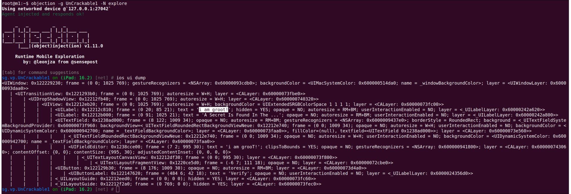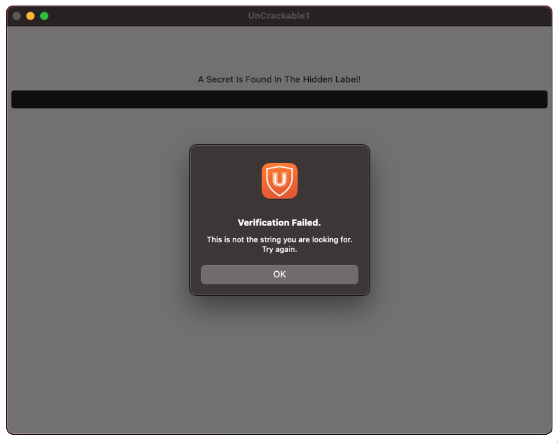 The OWASP’s UnCrackable1 app consists of a single input field with a button below it, that lets us verify if our input was correct or not. It also contains a hint, telling us that the secret can be found within a hidden label in the UI. There are multiple ways to reveal the secret from the hidden label. I used the tool objection, which is built on top of frida, to dump the UI of the app and read the secret.