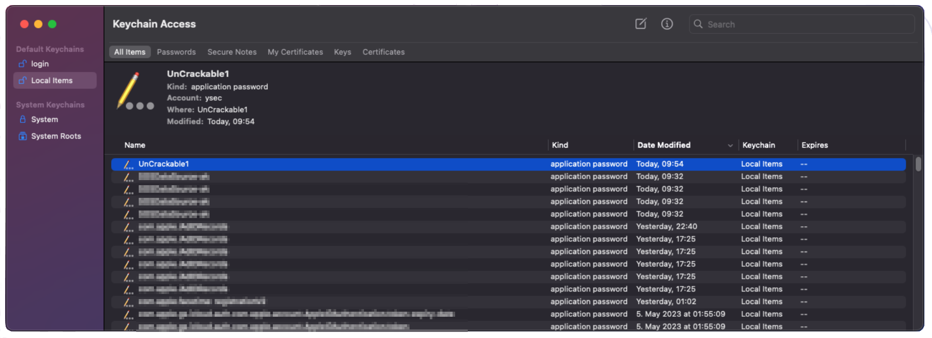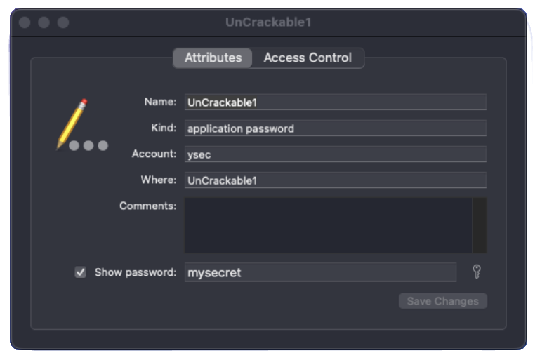Below is command that adds a new Keychain entry for the user ysec with the secret mysecret, which will be associated with the UnCrackable1 application. If the service parameter is left empty, the entry will show up as unknown in the Keychain.